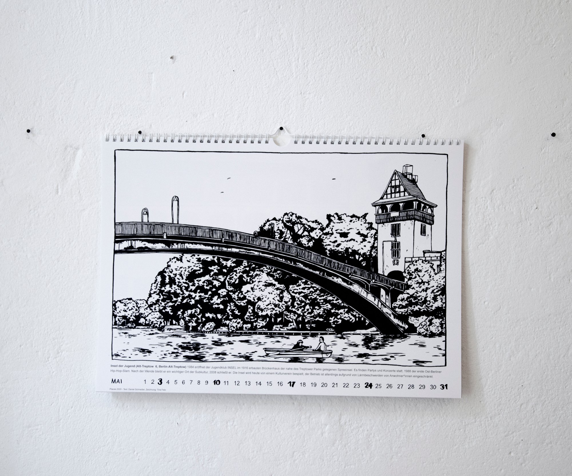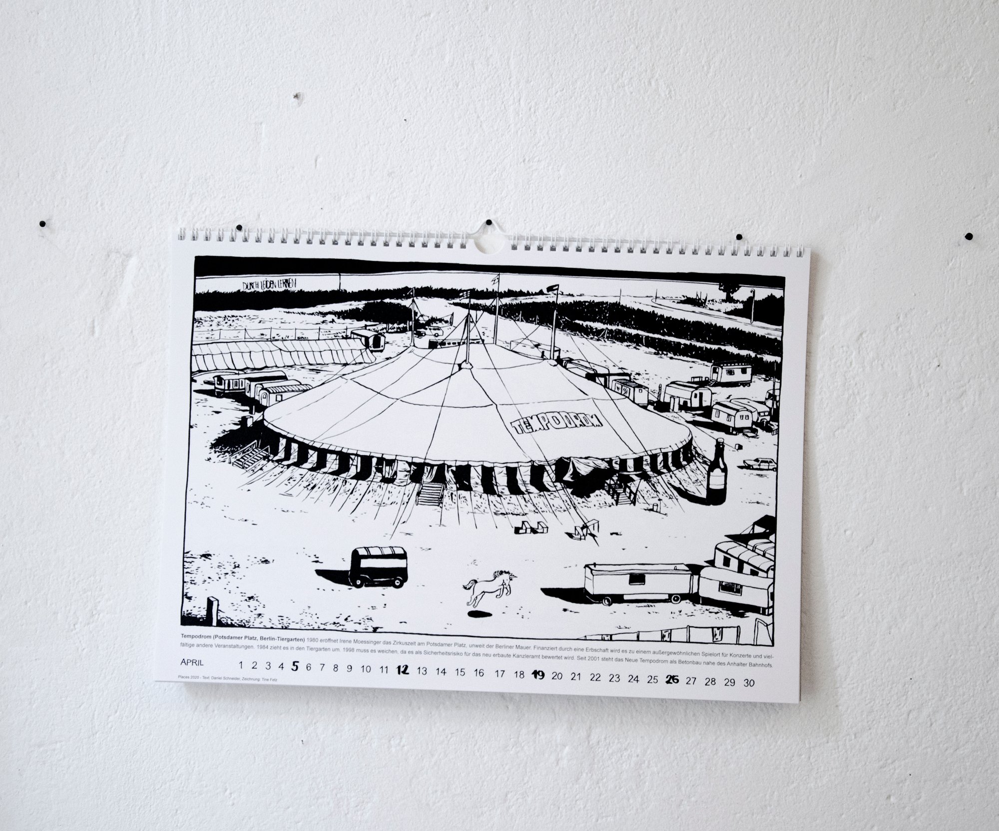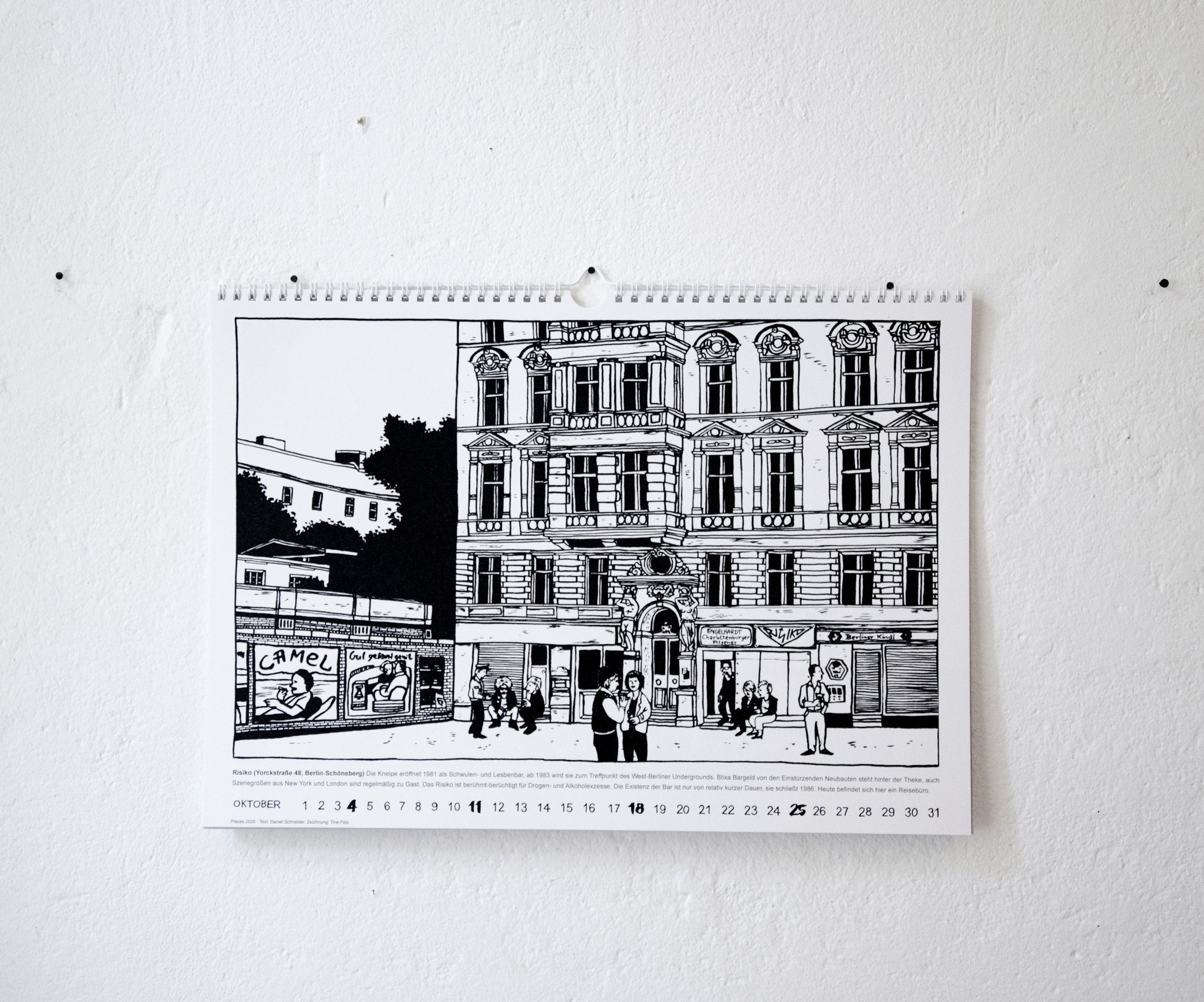 Calendar with 12 illustrations and short description of (sub-) cultural venues in Berlin that don't exist anymore.